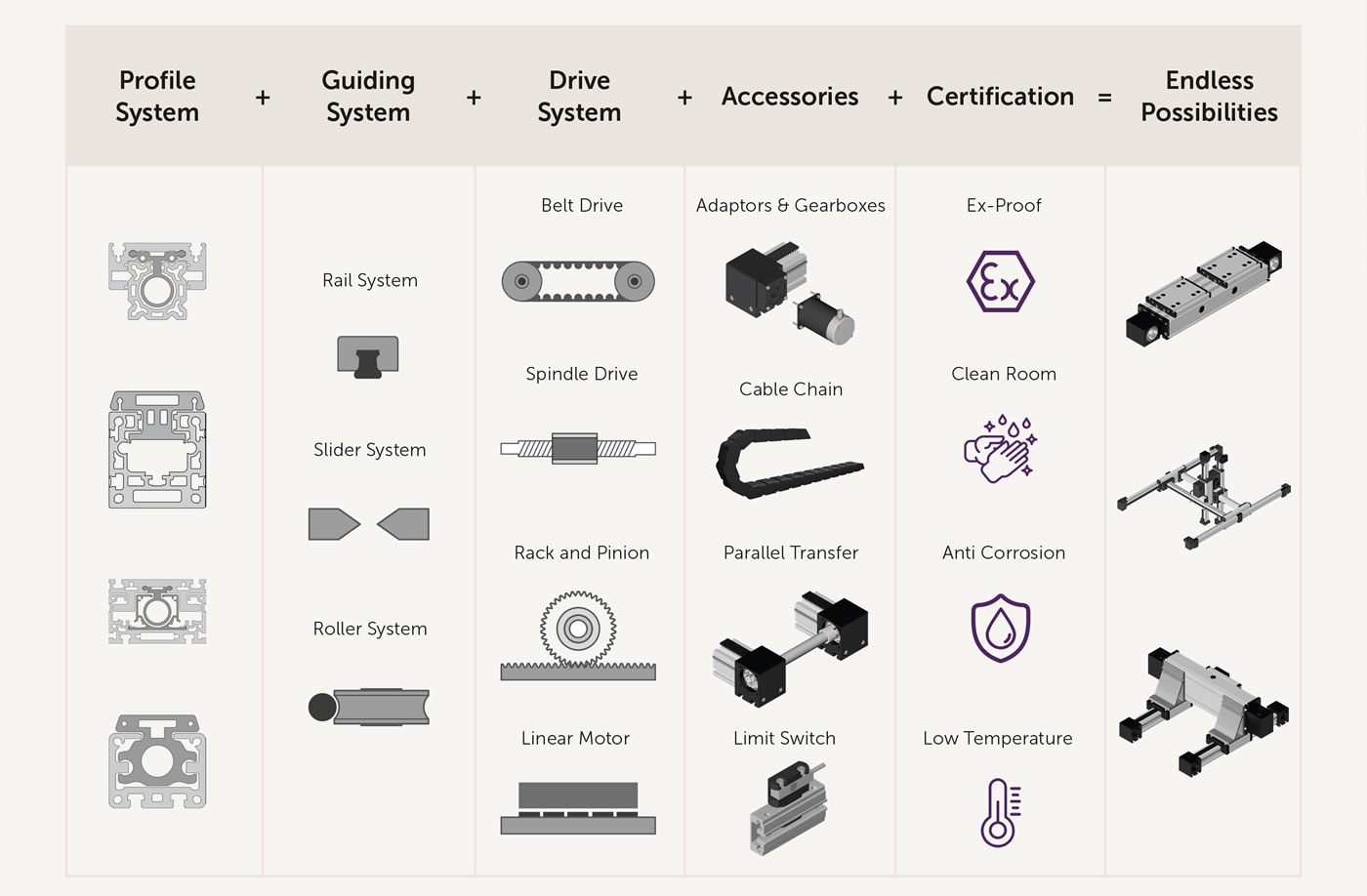 Tahrik seçenekleri: Dişli kayış, bilyalı / trapez vida, kremayer ve pinyon, lineer motor